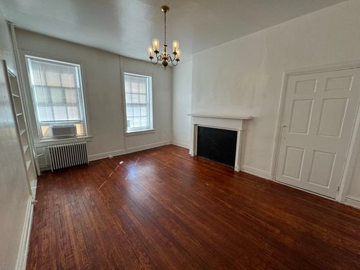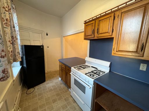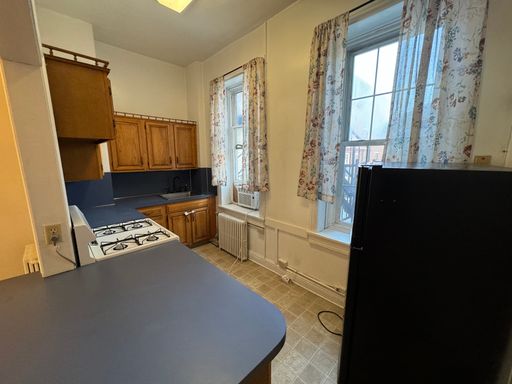 This charming apartment blends old-world character with generous space, featuring a large 17'7" x 12'6" living room and a 13' x 7' kitchen equipped with an oven-range and refrigerator, plus a counter overhang perfect for two bar stools.